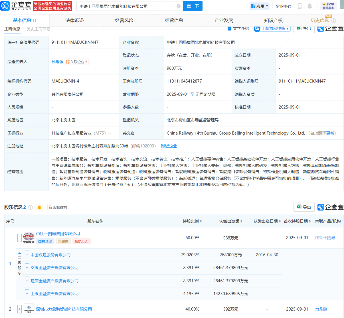 近日配资门户网官网首页,中铁十四局集团北京智能科技有限公司成立,法定代表人为孙延强,经营范围包含:人工智能硬件销售;人工智能基础软件开发;人工智能应用软件开发;人工智能行业应用系统集成服务;智能车载设备制造等。企查查股权穿透显示,该公司由中国铁建(601186)旗下中铁十四局集团有限公司、深圳市力鼎鹏智能科技有限公司共同持股。